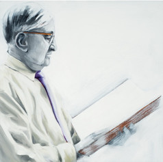 "Copydesk surge a partir de um arquivo pessoal que comecei a fazer em 2013, quando de fato venho a trabalhar com arquivos fotográficos institucionais. Encontrei uma foto do artista Joseph Albers lendo, onde sua postura e todo seu gestual dialogava com uma atmosfera muito familiar de imagens que tenho me apropriado desde o início da minha trajetória artística", conta a artista ao Esquina. "A partir disso, fui mergulhando nesse universo de imagens e criando costuras com processos artísticos que comecei a desenvolver em projetos anteriores, onde associo escrita com pintura e desenho."